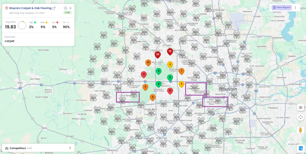 For the keyword carpet, you show up as # 3 in the areas around you, and #4 and below in the other areas close to you.